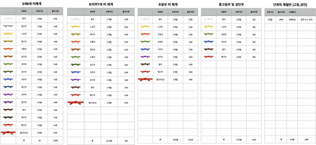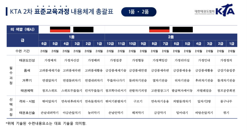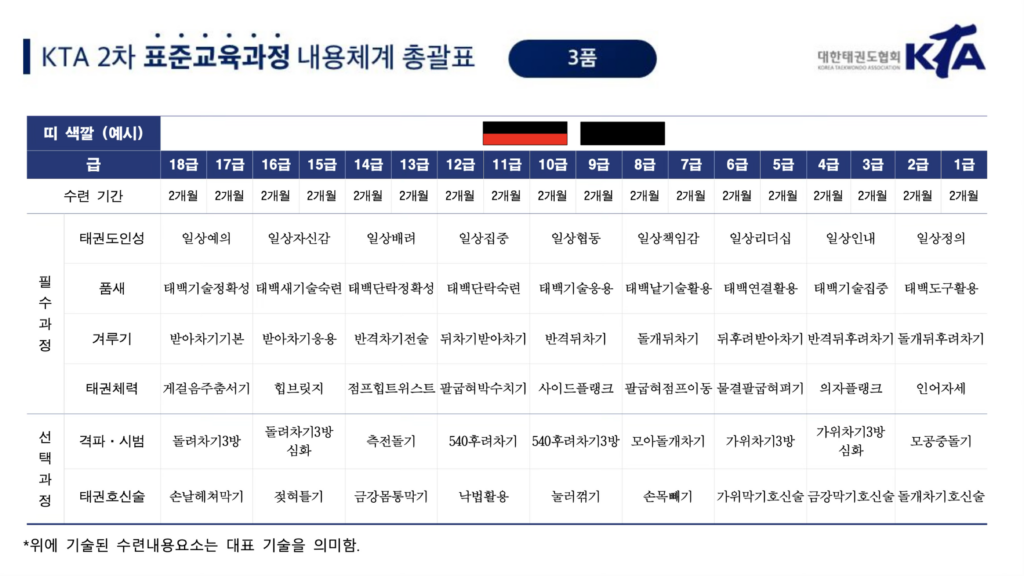 | 1주차 품새 과정 | 줄넘기프로그램 (Skipping Rope Training) : 순발력, 리듬감, 심폐지구력 향상 PAPS 프로그램 (Physical Activity Promotion System) : 국가 공인 체력 측정 기준을 반영한 성장 발달 관리 | 인성·가치교육 (Character & Values Education) 발달중심 신체 준비활동 (Developmental Physical Warm-Up) 품새역량수업 (Technical & Poomsae Training) 창의·협동 활동 (Creative & Cooperative Activities) | |||